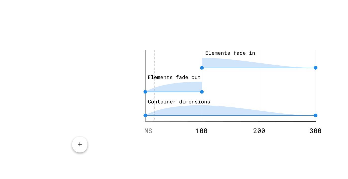 如果一个组合包含一个容器,比如按钮,卡片或列表,那么它的过渡设计应该是基于其容器进行动画的。容器通常很容易被发现,因为其可见的边界,但要记住,他们也可能在过渡开始前都不可见,就像一个没有分割线的列表。这个模式可以被分解为三个步骤: