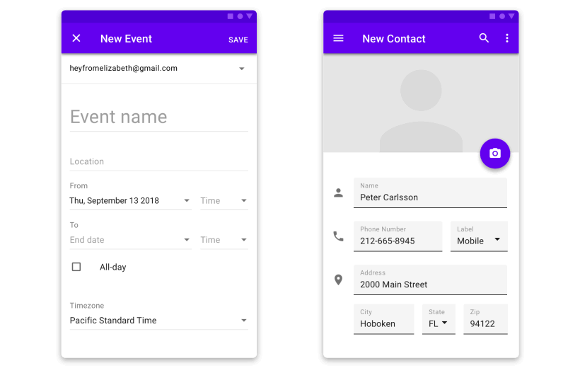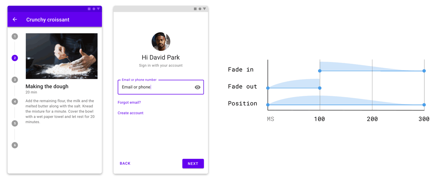 如果开始和结束的组合有一个清晰的空间和顺序上的关系,它们可以共享一个动效来加强这个关系。比如导航一个分步组件时,开始和结束的组合在淡入/淡出时共享一个垂直方向的滑动动效。这加强了它们垂直方向的排列布局。当点击一个引导页流程上的下一步按钮,这些组合共享一个横向的滑动动效。从左向右移动加强了流程上的概念。共享的动效使用了 Material’s standard easing。