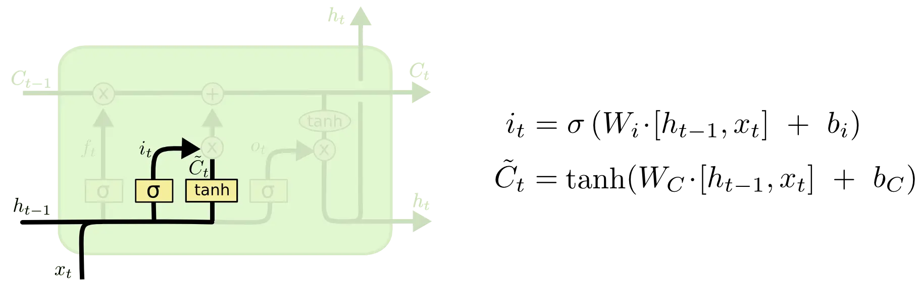下一步是决定我们要存储在单元格状态中的新信息。这有两个部分。首先,称为“input gate layer”的Sigmoid 层决定我们将更新哪些值。接下来,一个tanh层创建一个新的候选值向量Ct。这可以添加到状态。在下一个步骤中,我们将结合这两个来创建对状态的更新。