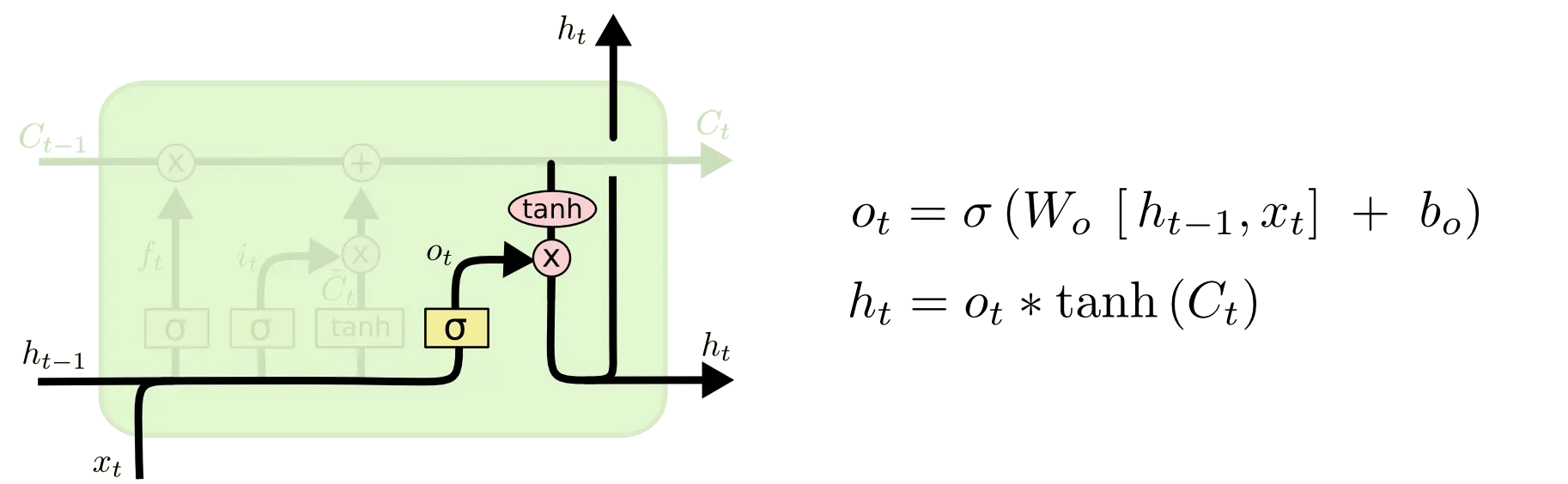 最后,我们需要决定我们将输出什么。此输出将基于我们的单元格状态,但是是经过过滤的版本。首先,我们运行一个Sigmoid层,它决定我们要输出的单元格状态的哪些部分。然后,我们将细胞状态通过tanh(将值推到1到1之间)。并将它乘以Sigmoid Gate的输出,以便只输出我们决定的部分。