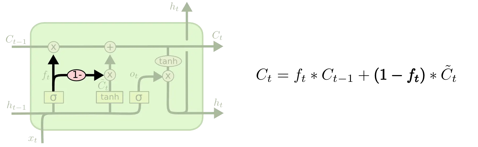 另一种变化是使用耦合遗忘和input gate。不是单独决定忘记什么,而是我们应该添加新信息,我们一起做出这些决定。我们只会忘记在什么地方输入什么东西。当我们忘记旧的东西时,我们只向状态输入新的值。