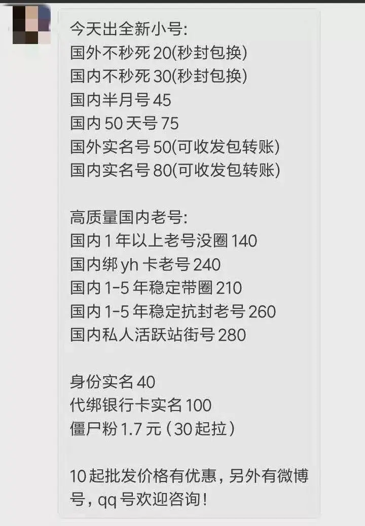 这些被交易买卖的微信号,由黑产上游通过盗号、产号和养号这几种方式生产制造出来。在黑市滋生出买卖微信号的市场,容易被封的新号 10 元左右,老号 200 元左右。绑定了银行卡、有实名认证的老号,价格约为 300 元一个。