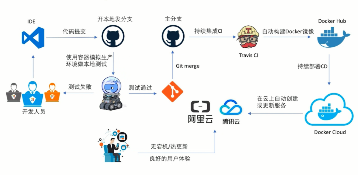- 本地用github做代码的管理,Travis CI用于构建docker,docker的镜像发布到docker hub,docker hub又和docker cloud做了个集成处理,通过docker image 在公有云上做一个部署。进行服务的更新。
