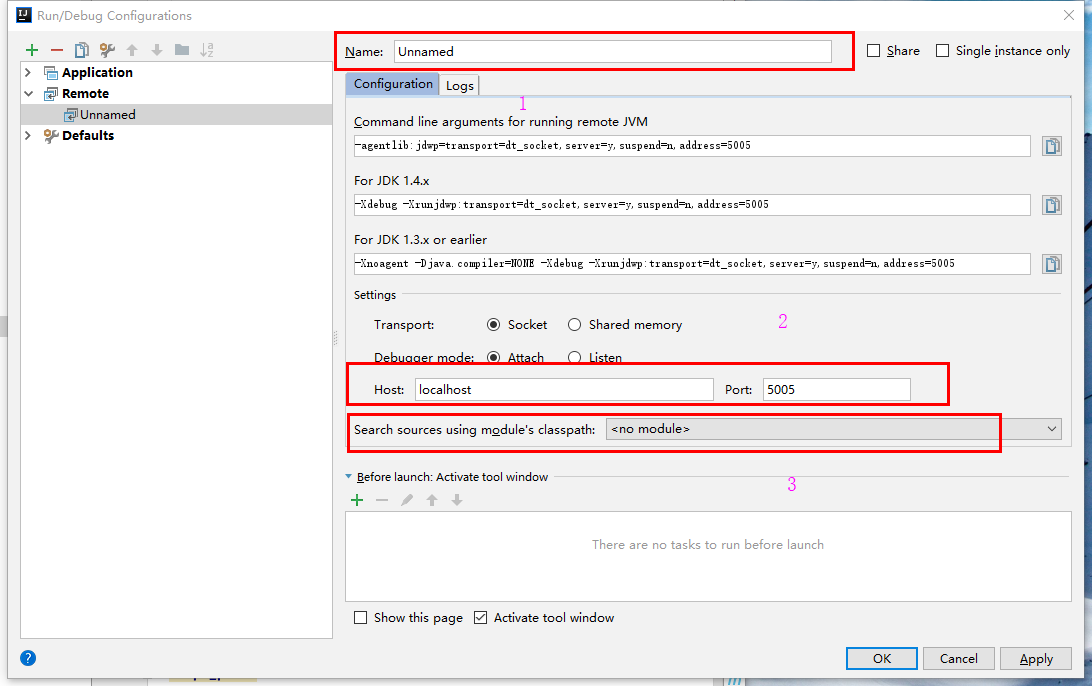 在【1】中填入Remote项目名称,在【2】中填IP地址和端口号,在【3】选择远程调试的项目module,配置完成后点击OK即可