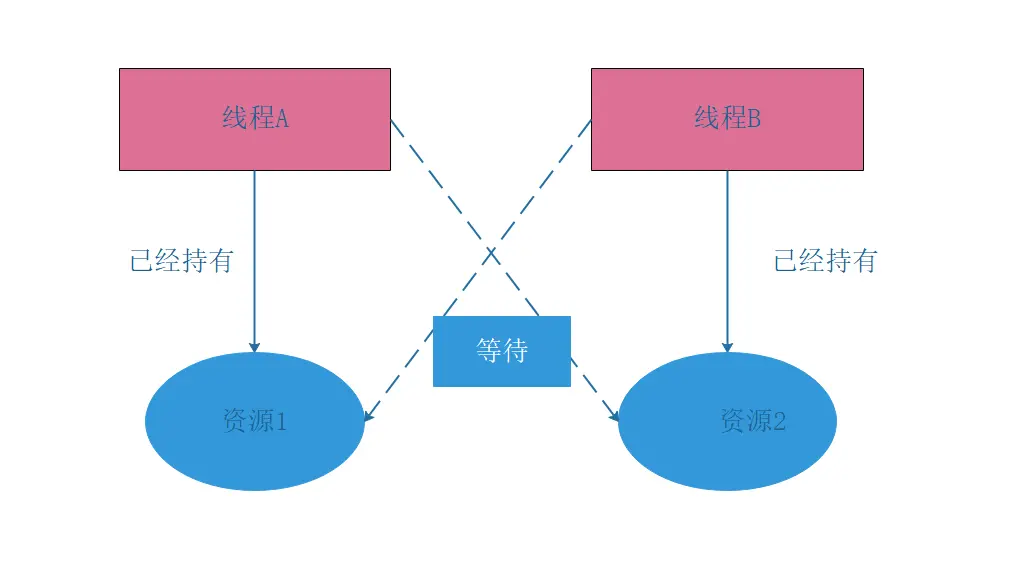 线程 A 持有 objectA 资源并等待获取 objectB 资源,而线程 B 持有 objectB 资源并等待 objectA 资源,这构成了循环等待条件。