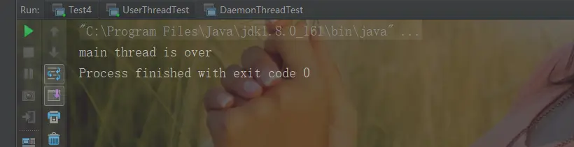 如上代码在 main 线程中创建了一个 thread 线程,thread 线程里面是无限循环,运行代码从结果看 main 线程已经运行结束了,那么 JVM 进程已经退出了?从 IDE 的输出结侧上的红色方块说明 JVM 进程并没有退出,另外 Mac 上执行 ps -eaf | grep java 会输出结果,也可以证明这个结论。