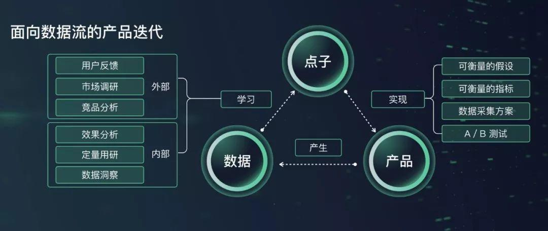 在传统的产品迭代方式中加入数据变成三个环节:点子、产品、数据。