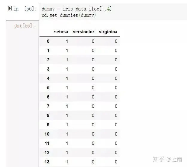 假设这里我们想要对比的基准类是setosa,只需要保留versicolor、virginica对应的编码后变量。那么当versicolor、virginica都取值为0时,则代表取值为setosa。