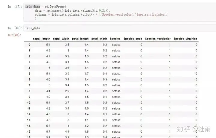 iris_data = pd.concat([iris_data,dummy.iloc[:,0:2]], axis= 1)pandas中的get_dummies方法提供了非常简单高效的哑变量处理方案,只有短短的一句代码即可。