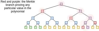 我们可以将这个三步的机制转化为一个非交互式证明,也就是在利用 Fiat Shamir heuristic 的基础上,一个证明者可以将它进行广播,然后被所有人进行验证。证明者首先构建一棵 P(x) 和 D(x) 值的 Merkle 树,然后计算树的根哈希。根自身随后被用作是熵的来源,熵决定了证明者需要提供树的哪个分支。证明者然后一起广播 Merkle 树根和分支作为证明。计算全部在证明者一端完成。从数据中计算 Merkle 树根,然后用它来挑选要审计的分支,高效地取代了一个交互式验证者的需要。