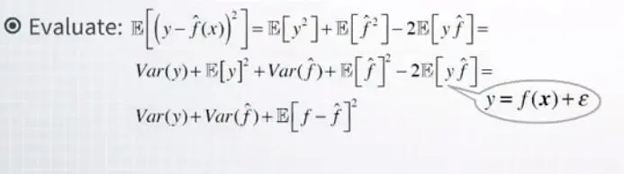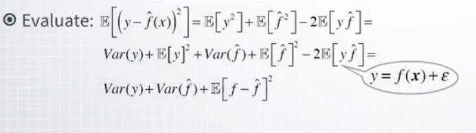 因此,这种最小化问题是这个表达式,平方损失函数的期望展示在这里。这里的符号e意味着我们对所有可能的组合计算期望,即f(x)和 epsilon,这可能在我们新的,尚未见到的数据中遇到。