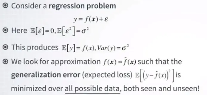 这里 epsilon 是一个随机误差项,均值为 0 和方差为 sigma 平方。我们希望找到函数f(x)的近似值,它可以很好地泛化。这是什么意思?这意味着,这种近似应该最小化所有数据的平方损失函数,y-f(x)的平方,无论是看到的还是看不见的。