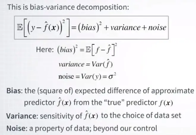 现在我们得到了一个特殊的名字,它被称为偏差 - 方差分解。这是先前公式的拆开表述,让我们再读一遍。它表示回归问题的泛化误差等于偏差平方,方差和噪声之和。让我们一个接一个地讨论这些术语。偏差平方是近似预测器和真实预测器之间预期差异的平方。方差衡量估计器对数据选择的敏感性。