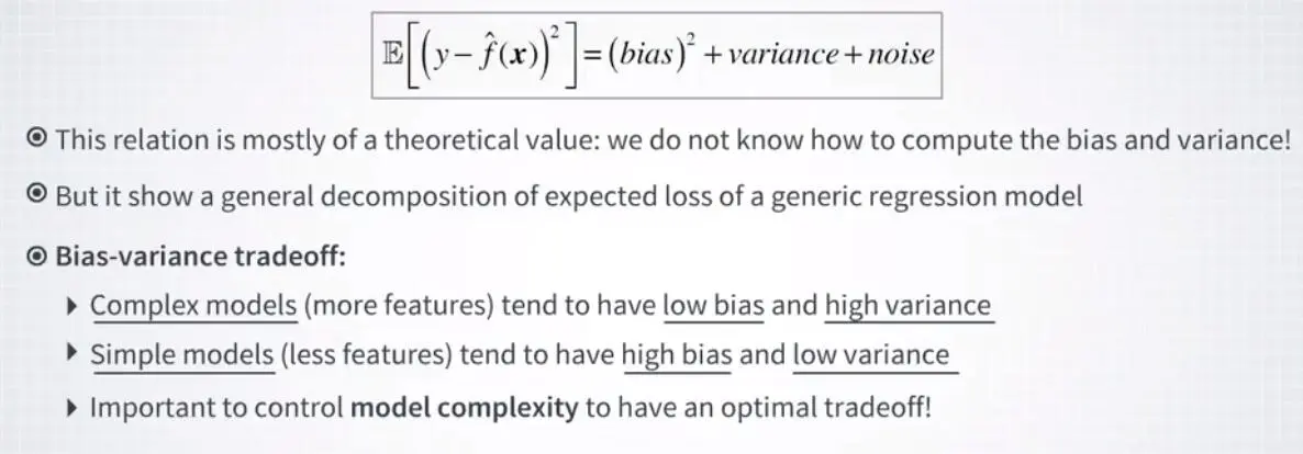 现在,重要的是要注意,偏方差分解主要是理论值。实际上,我们不知道真实预测器 f(x),我们不知道如何计算偏差和方差项中出现的期望值。但是,它显示了两种不同的模式,通过这两种模式,模型的泛化误差可能会恶化。你的模型可能有很大的偏差,或者它可能有很大的方差。