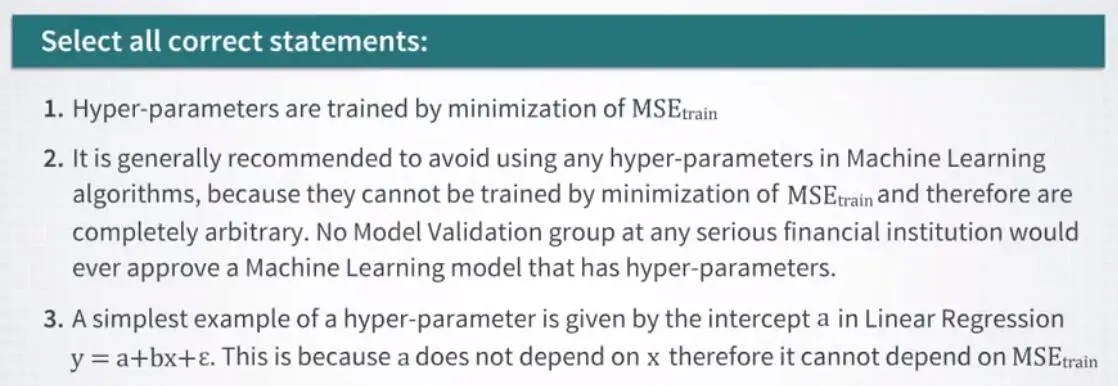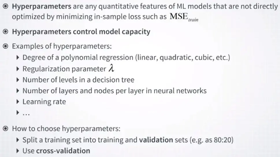 我们将在此专项中看到更多超参数的例子,但那些超参数是什么?通常,超参数是机器学习算法的任何定量特征,它们不通过最小化训练或样本内损失,诸如 MSE train,而直接优化。