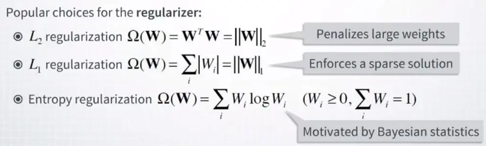 我将在几分钟内解释我们如何选择 lambda 的最佳值,但首先让我向你展示机器学习中常用的正则化器的一些流行示例。