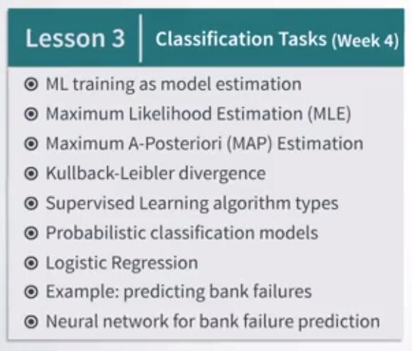 然后你会看到,所有这些机器如何应用于分类问题。你将了解最强大的分类方法之一,称为逻辑回归。你还将学习如何在 scikit-learn 和 TensorFlow 中实现它。你将看到另一个特例,逻辑回归是如何被称为神经网络的通用锤子。最后,我们的锤子将找到第二个金融的钉子,这将成为预测银行破产的问题。正如你将看到的,我们的锤子对于这种类型的钉子来说非常好。所以这就是你将在本周掌握的内容。