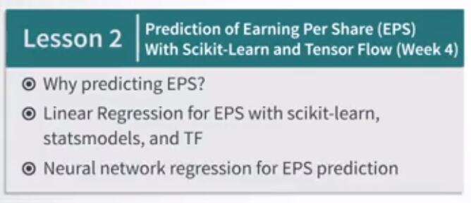 所有这些主题将在第一课中介绍。然后在我们得到如此强大的锤子后,我们将开始寻找金融的钉子。你会看到的第一个钉子是一个非常经典的金融问题,即预测每股收益或简称 EPS 的问题。
