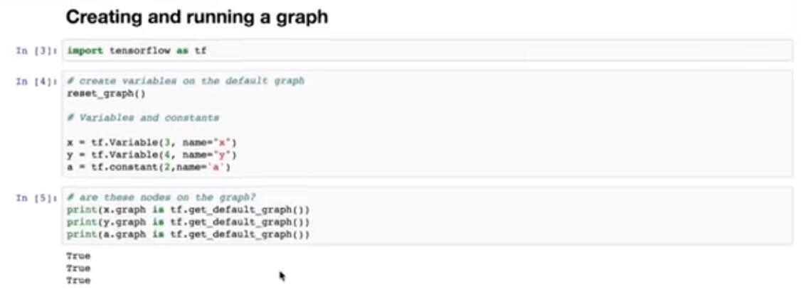 作为我们可以做的第一件事,我们启动下面的单元格,我们通过使用此函数,在默认图中创建它。然后我们为两个变量 x 和 y 创建三个节点。而且一个常量。它们将分别通过值 3,4 和 2 初始化。现在,让我们检查一下我们创建的节点是否确实在默认图上。很好,就是这样。