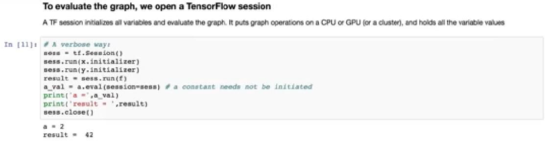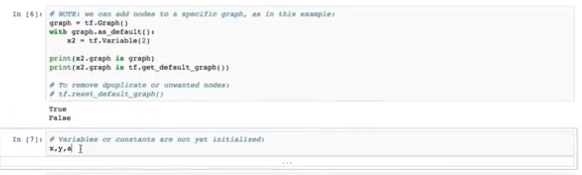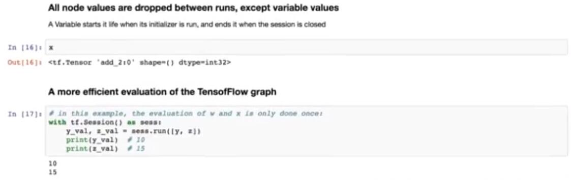 因此,在运行单元格之后,我们可以再次检查节点 x 的状态,然后再次看到初始化的图。此外,这里代码同时改变 w 和 x 两次,来计算 y 和 z,来分离图的 trans。通过告诉 TensorFlow 在一个解析中完成图上所有计算,可以更有效地完成此操作。此单元格中显示了此语法。这是我们的做法。