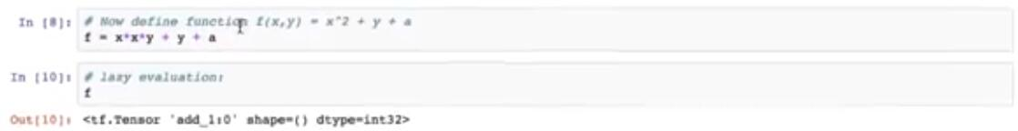 下一个单元格,我们定义一个函数 f 等于 x 平方加 y 加 a。我们来求值单元格。如果我们现在固定 f 的值,我们会看到它是类型为add的 Tensor。还没有 f 的值,这是 TensorFlow 中延迟求值的一个例子。