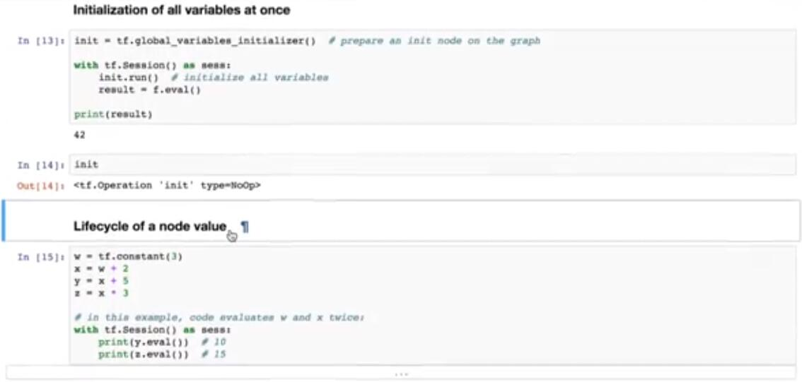 最后,如果我们在这里引入一个新节点,整个代码可以更短。这样可以同时处理所有标签的初始化。以下是我们如何使用它。因此,如果我们运行此单元格,我们再次看到相同的结果。要检查 TensorFlow 创建的节点,我们可以在此处键入init。结果就是这样。我们的下一个插图显示了节点值的生命周期。创建节点时,它仅仅向运行 TensorFlow 会话时的执行阶段添加值。让我们考虑这个例子。这里我们创建一个常数 w 等于 3 的节点,然后我们创建三个 x,y 和 z。