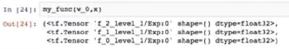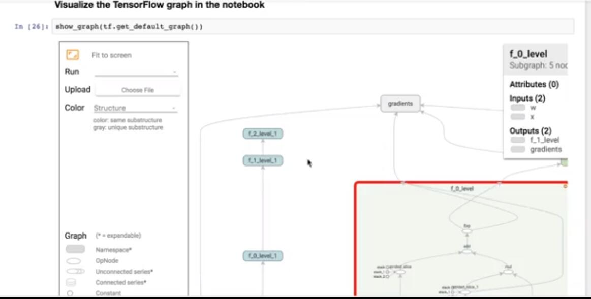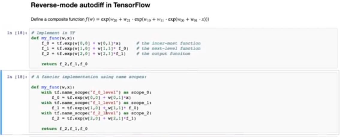 如果我们求解它,我们会得到相同的结果。接下来,我想演示 TensorFlow 中反向模式自动微分的工作原理。让我们考虑一下这里显示的函数。它是指数的指数的指数。这个函数实际上非常类似于我通过神经网络实现的损失函数。因此,此示例可能对你理解 TensorFlow 中神经网络的工作非常有用。让我们看看我们如何实现这个函数。这非常简单,并在此单元格中显示。这里,我们首先定义输入单元的 Tensor 值输出,然后将其用作输入来计算第二层的输出。最后,使用最后一个输出来生成函数的值。我们将这三个值作为函数的输出返回。这是在单元格上。我们还可以在其上面进行一些综合探索,并在其自己的范围内定义每个层,就像在此单元格中显示的一样。