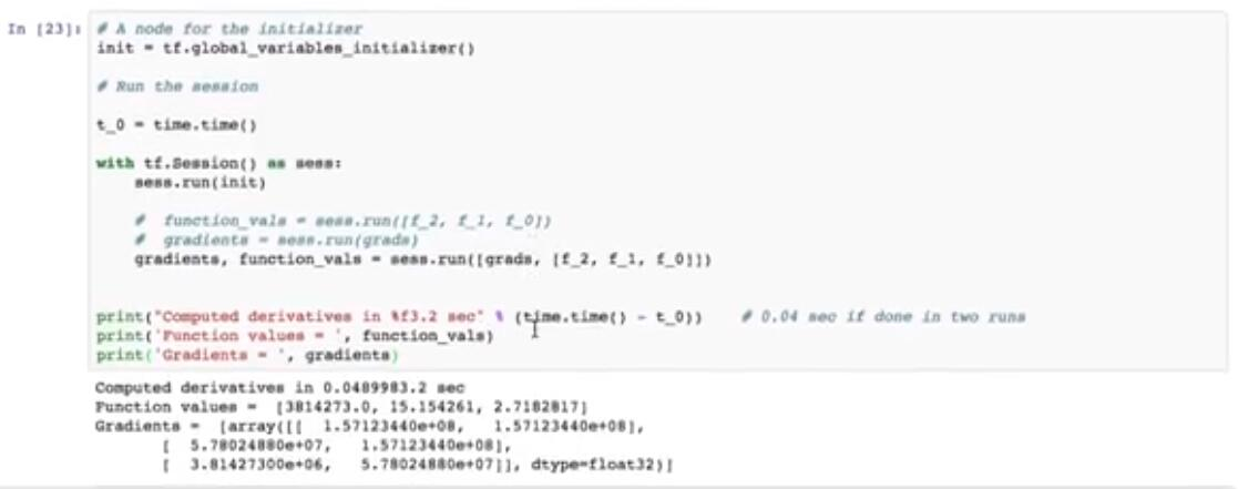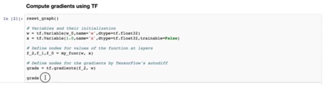 所以让我们求解它,并看到它返回的张量。这里的求解只需通过调用tf.gradients完成,其中包含两个参数,函数的名称 f2 和我们要调用来计算梯度的变量。