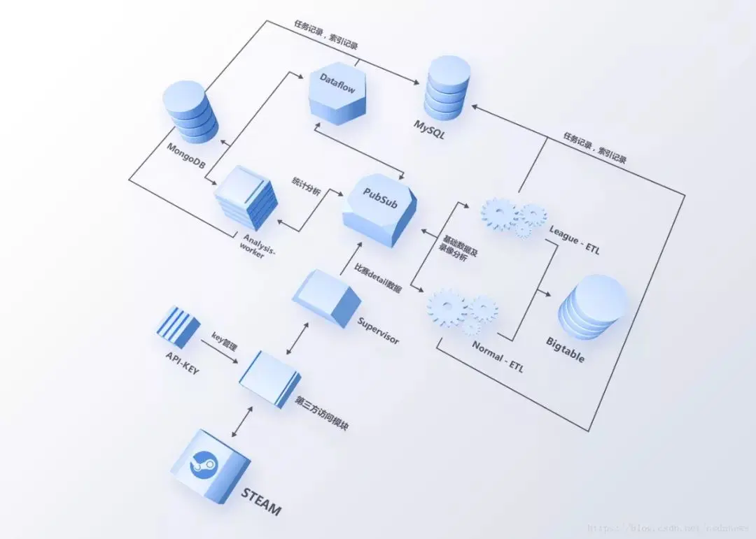 基础数据,即比赛的详情信息(KDA、伤害与补刀等数据)和录像分析数据(Roshan击杀数据、伤害类型与英雄分路热力图等数据),由Supervisor获取Steam数据触发,经过worker的清理后存入Google Bigtable;