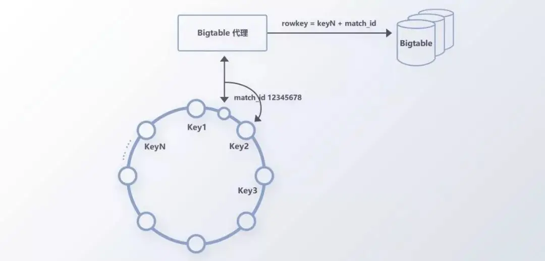 如图7,我们在Hash环上先预设多个key值作为RowKey的前缀,当获取到match_id时,通过一致性哈希算法得到match_id对应在Hash环节点的key值,最后通过key值与match_id拼接构建RowKey。