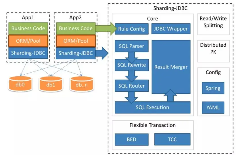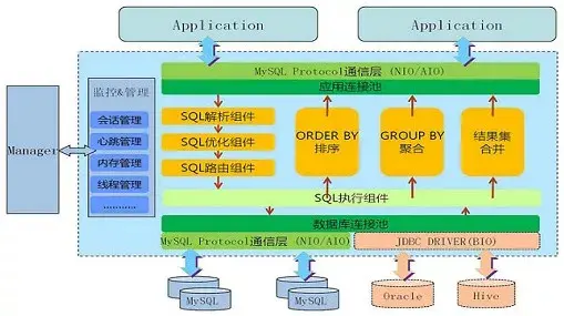 通过修改数据访问层,如JDBC、Data Source、MyBatis,通过配置来管理多个数据源,直连数据库,并在模块内完成数据的分片整合,一般以Jar包的方式呈现。