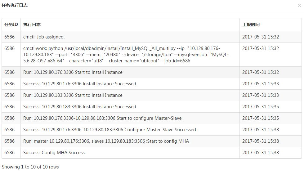 然后我们监控上报的任务日志可以看到底层执行过程,大家可以看到任务会创建2个实例,然后配置了主从,最后配置了MHA,当然这里面还有一些元数据维护,备份和监控开关设置等等,其实在后台已经完成了。大概6分钟,完成了一个DBA半天的工作,并且保证了部署的数据库都是标准化的,不同DBA部署没有任何差异。