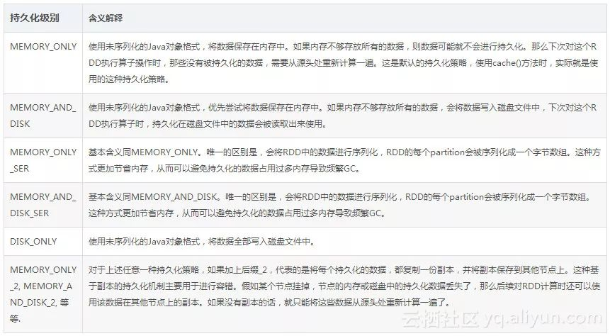 默认情况下,性能最高的当然是MEMORY_ONLY,但前提是你的内存必须足够足够大,可以绰绰有余地存放下整个RDD的所有数据。因为不进行序列化与反序列化操作,就避免了这部分的性能开销;对这个RDD的后续算子操作,都是基于纯内存中的数据的操作,不需要从磁盘文件中读取数据,性能也很高;而且不需要复制一份数据副本,并远程传送到其它节点上。但是这里必须要注意的是,在实际的生产环境中,恐怕能够直接用这种策略的场景还是有限的,如果RDD中数据比较多时(比如几十亿),直接用这种持久化级别,会导致JVM的OOM内存溢出异常。