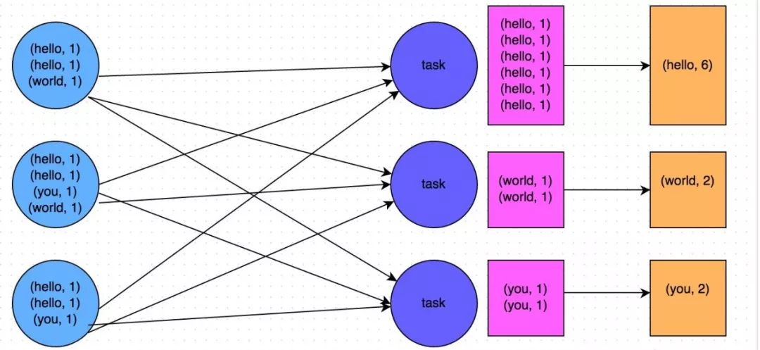 因此一个stage刚开始执行的时候,它的每个task可能都会从上一个stage的task所在的节点,去通过网络传输拉取需要自己处理的所有key,然后对拉取到的所有相同的key使用我们自己编写的算子函数执行聚合操作(比如reduceByKey()算子接收的函数)。这个过程就是shuffle。