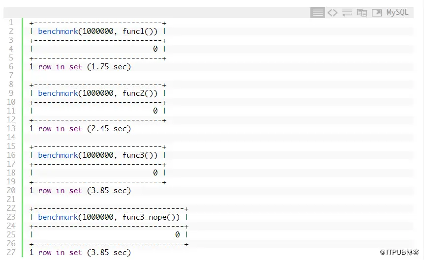 让我们比较以下四个简单的存储函数(在MySQL 5.7中):