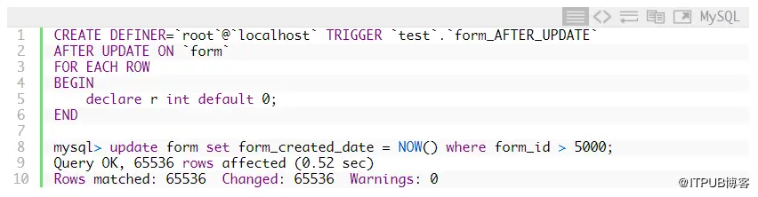 当然,如果我们执行的函数不太多,我们可能注意不到这些性能上的差异,但是它会在触发器内部产生影响。假设我们在表上有一个触发器,每次更新该表时,它都会执行触发器来更新字段。比如,假设我们有一个名为“form”的表,我们只需要更新它的创建日期: