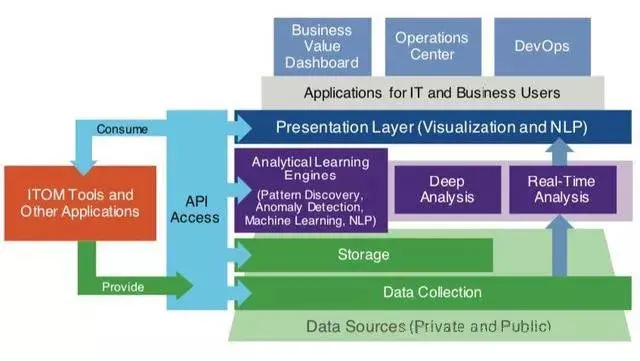 在Monitoring(监控)、Service Desk(服务台)、Automation(自动化)之上,利用大数据和机器学习持续优化,用机器智能扩展人类的能力极限,这就是智能运维的实质含义。