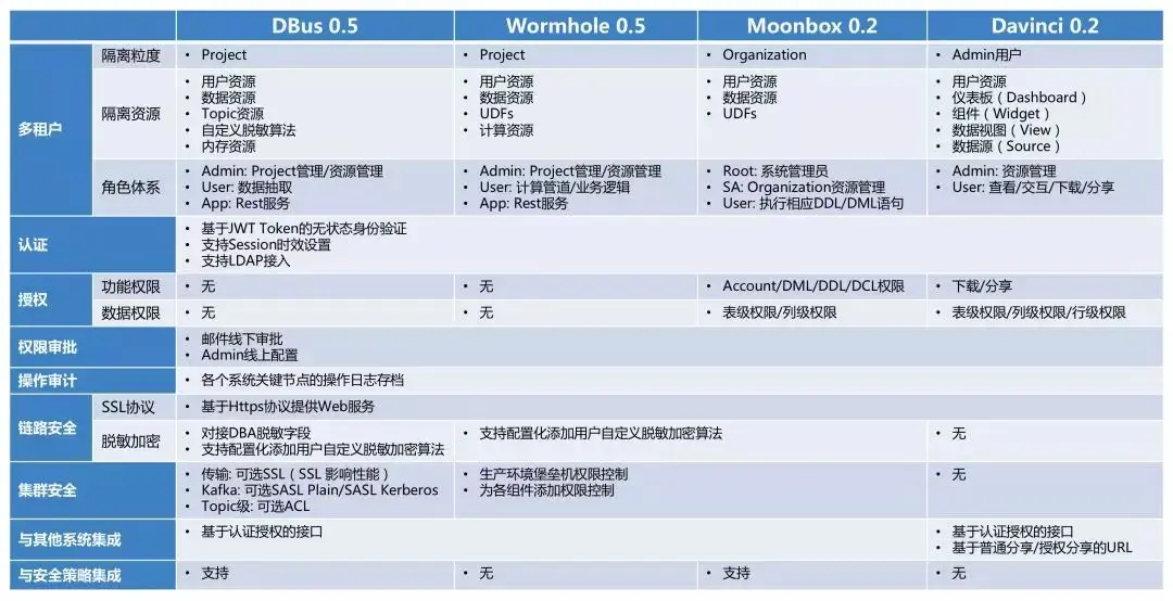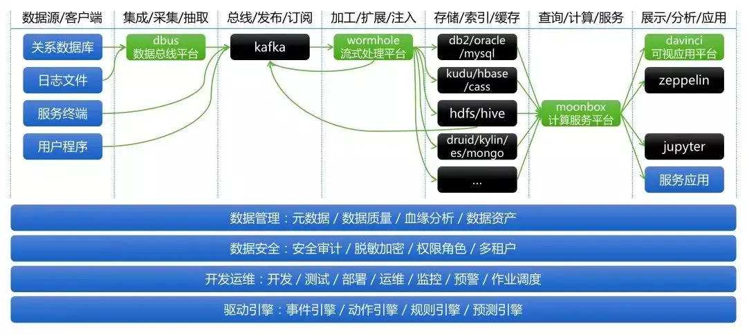 切面话题如数据管理、数据安全、开发运维、驱动引擎,可以通过对接DBus、Wormhole、Moonbox、Davinci的服务接口进行整合和二次开发,以支持端到端管控和治理需求。