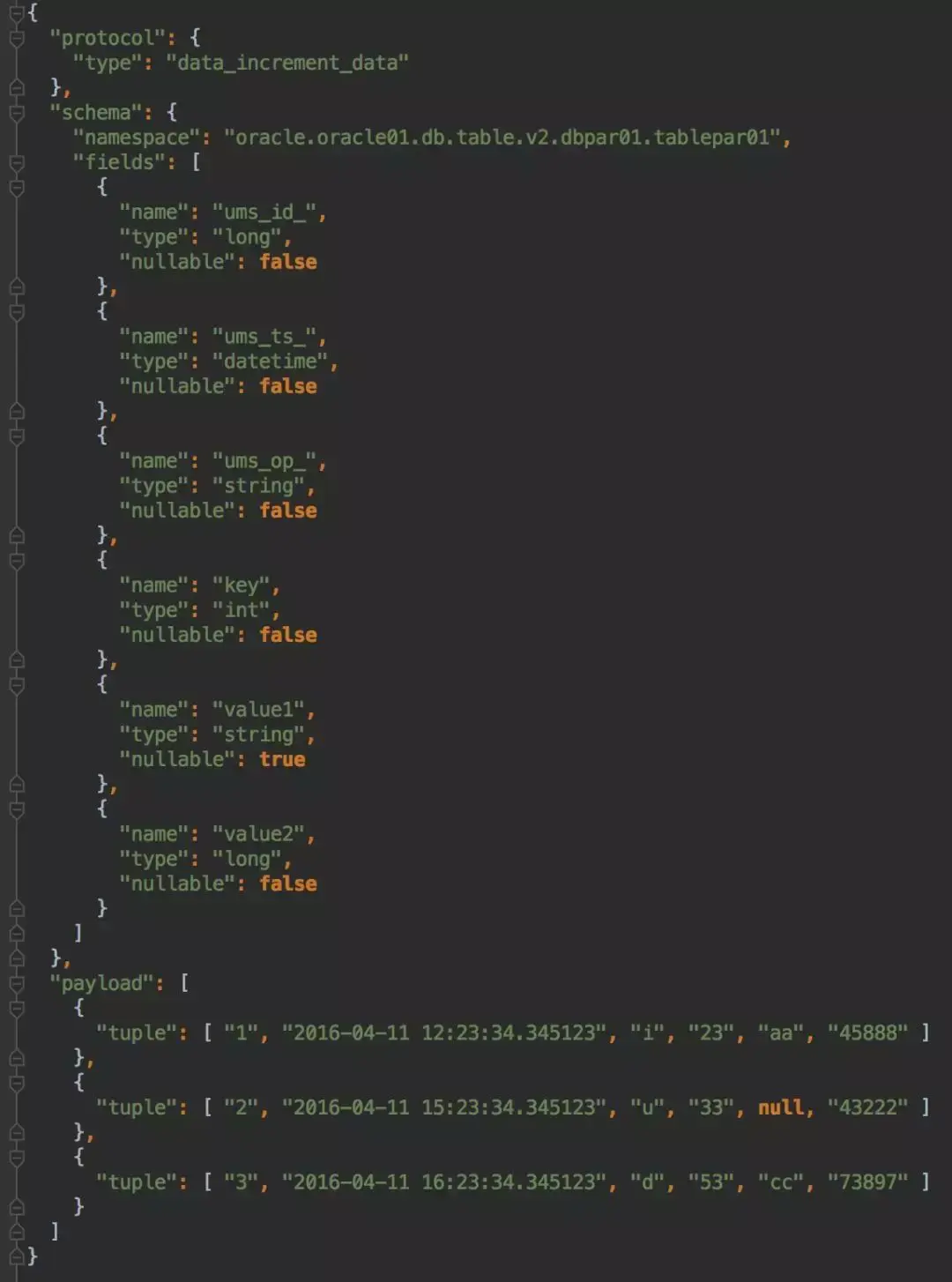 UMS消息会自带Schema的Namespace信息,Namespace是一个7层定位字符串,可以唯一定位任何表的任何生命周期,相当于数据表的IP地址,形式如下:
