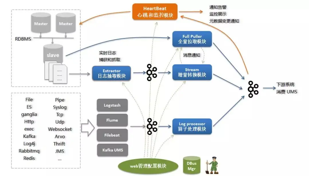 负责对接不同的数据源,实时抽取出增量数据,对于数据库会采用操作日志抽取方式,对于日志类型支持与多种Agent对接。