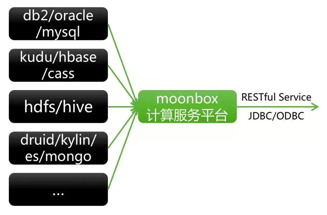 计算服务平台Moonbox,作为统一计算服务平台,对异构数据存储端负责整合、计算下推优化、异构数据存储混算等(数据虚拟化技术),对数据展示和交互端负责收口统一元数据查询、统一数据计算和下发、统一数据查询语言(SQL)、统一数据服务接口等。