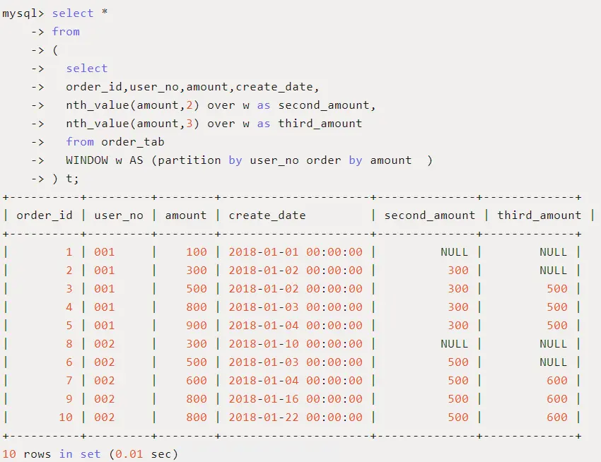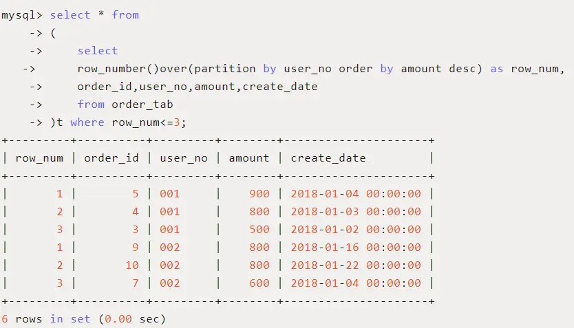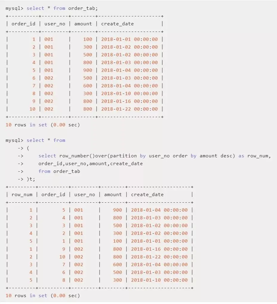 上面例子中,row_number()over(partition by user_no order by amount desc)这部分都属于窗口函数,它的功能是显示每个用户按照订单金额从大到小排序的序号。