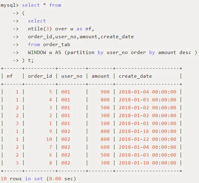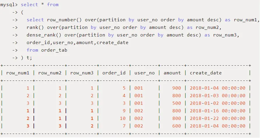 上面红色粗体显示了三个函数的区别,row_number()在amount都是800的两条记录上随机排序,但序号按照1、2递增,后面amount为600的的序号继续递增为3,中间不会产生序号间隙;rank()/dense_rank()则把amount为800的两条记录序号都设置为1,但后续amount为600的需要则分别设置为3(rank)和2(dense_rank)。即rank()会产生序号相同的记录,同时可能产生序号间隙;而dense_rank()也会产生序号相同的记录,但不会产生序号间隙。
