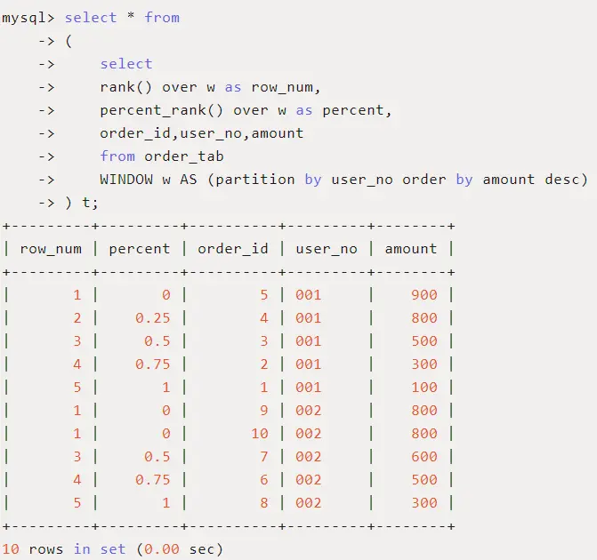 从结果看出,percent列按照公式(rank - 1) / (rows - 1)带入rank值(row_num列)和rows值(user_no为‘001’和‘002’的值均为5)。