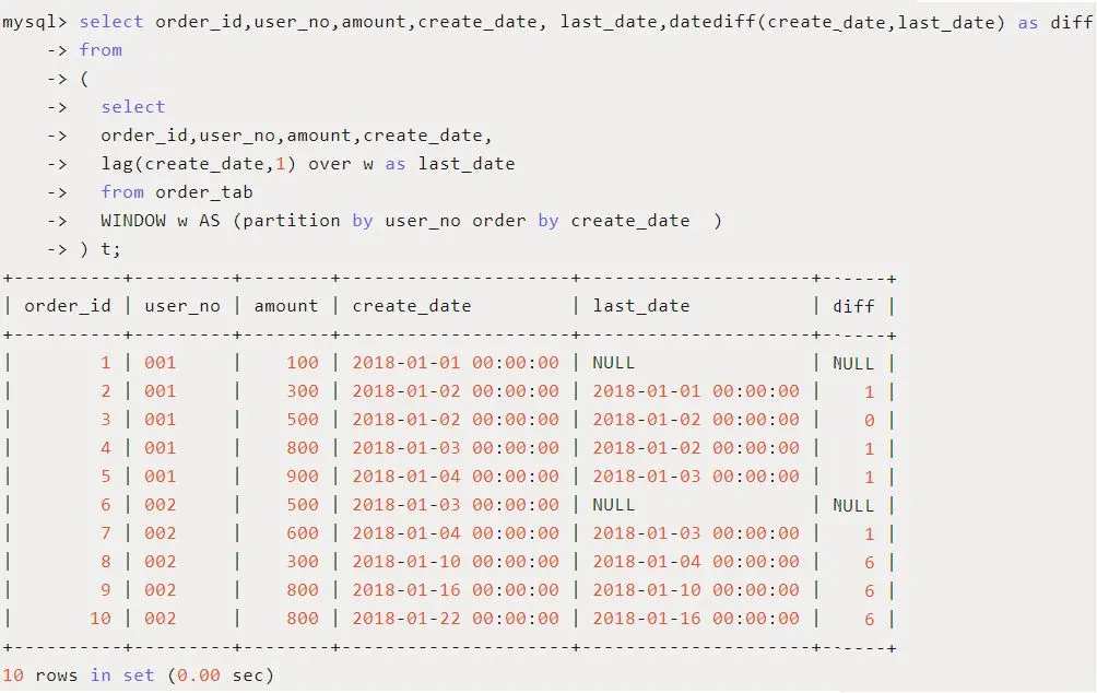 内层SQL先通过lag函数得到上一次订单的日期,外层SQL再将本次订单和上次订单日期做差得到时间间隔diff。