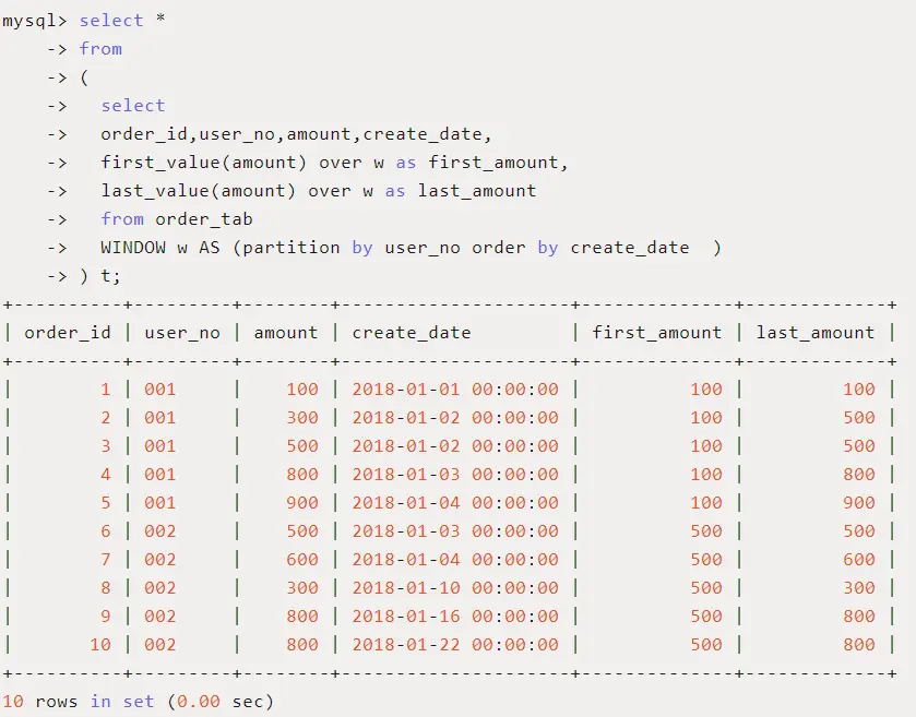 结果和预期一致,比如order_id为4的记录,first_amount和last_amount分别记录了用户‘001’截止到时间2018-01-03 00:00:00为止,第一条订单金额100和最后一条订单金额800,注意这里是按时间排序的最早订单和最晚订单,并不是最小金额和最大金额订单。
