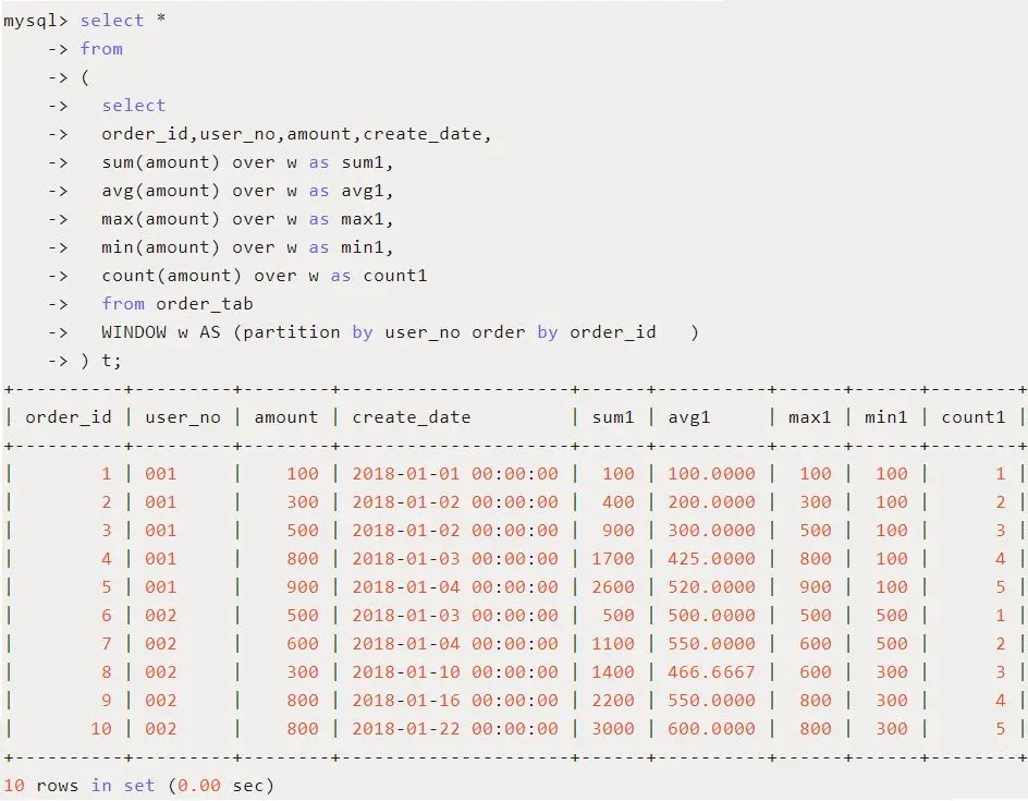 应用场景:每个用户按照订单id,截止到当前的累计订单金额/平均订单金额/最大订单金额/最小订单金额/订单数是多少?