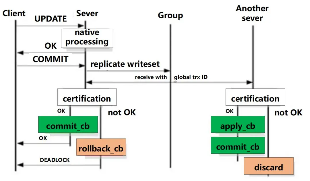 首先,Galera集群节点间同步复制,主要基于广播write set和事务验证来实现多节点同时commit、冲突事务回滚等功能。