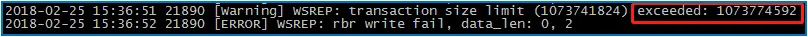 根据Galera复制原理,删除事务在本地节点提交成功时,本地节点把事务通过write set复制到集群另外两个节点,之后各个节点独立异步地进行certification test,由于要删除的数据量非常大,该事务已超过同步复制写入集(生产环境中write set设定值为1G),因此,本地节点无法得到certification信息,事务并没有插入待执行队列进行物理提交,而是在本地优先被回滚。