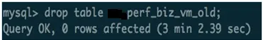 Step 6:处理perf_biz_vm_old旧表,在业务低谷期执行如下操作:drop table if exists perf_biz_vm_old,Drop掉整张旧表的时间约为3min,并释放了150G的磁盘空间。需要注意的是,虽然drop table的时间较短,仍会产生短暂的阻塞,因为drop table触发的是实例锁,因此需要在业务低谷期进行操作,并实时观察数据库情况。